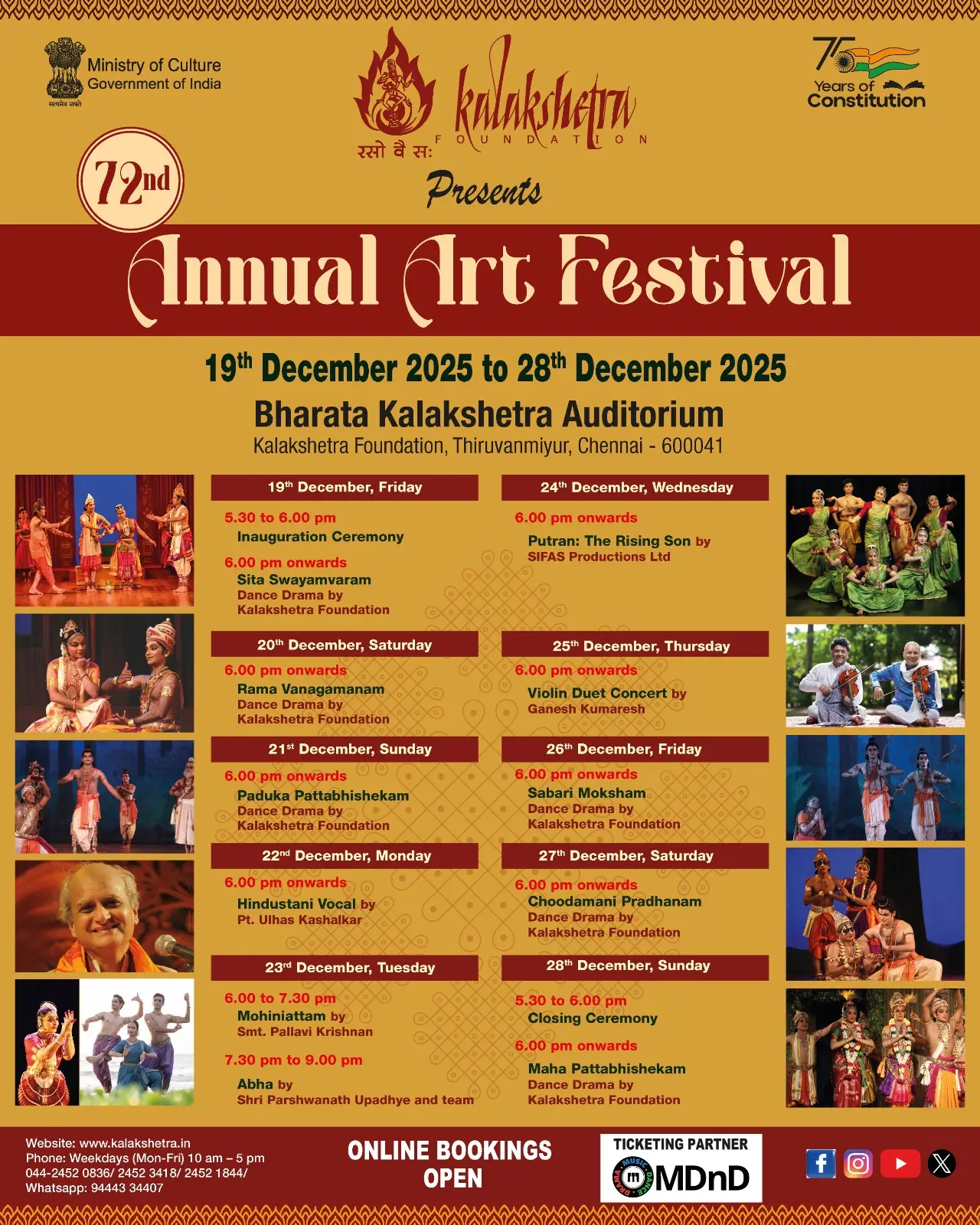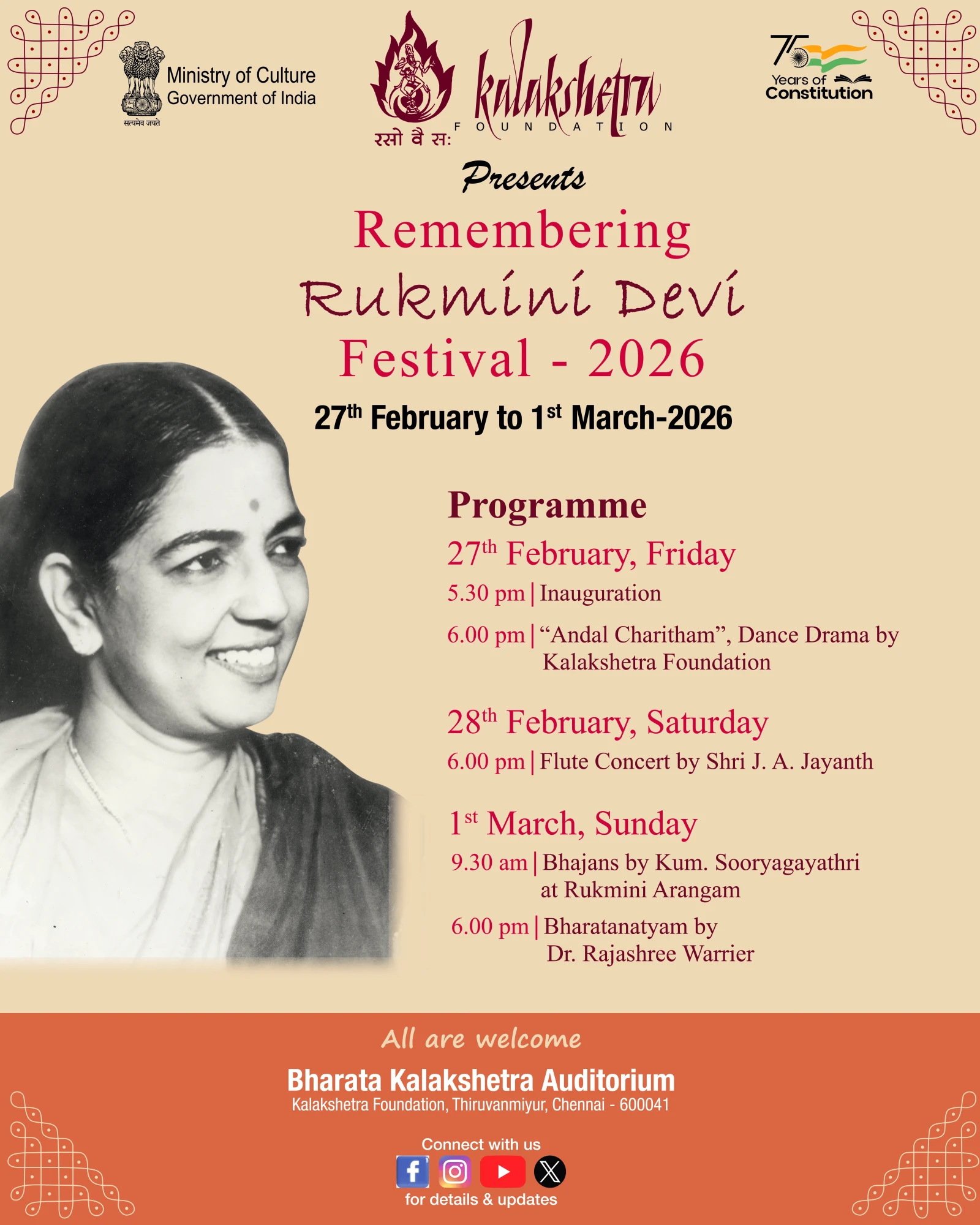 Kalakshetra, as the name suggests, is a centre for artistic endeavour. Founded in 1936 by the vibrant visionary Rukmini Devi Arundale, the Institution stands testimony to her dream of creating a space where the essence of Indian thought would find expression through artistic education. An institution she established with the vision “of imparting to the young the true spirit of Art, devoid of vulgarity and commercialism.” Spread over almost 100 acres by the seashore in Chennai, the Kalakshetra Foundation, as it is known today, is a vital centre for the study and performance of fine arts.